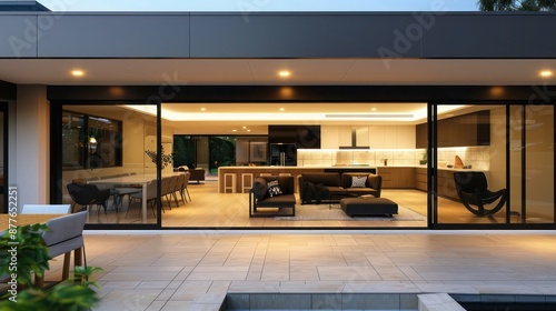 © Ramzan, Naklejka premium seamless blend of indoor and outdoor living spaces in a suburban modern home with sliding glass doors