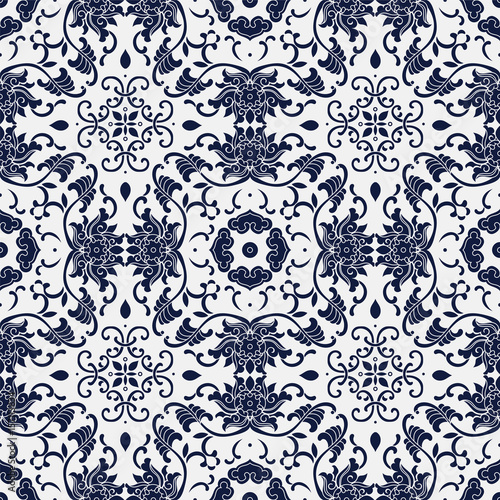 Fototapeta premium Seamless Blue Chinese Background Asian botanic garden spiral vine leaf flower chintz