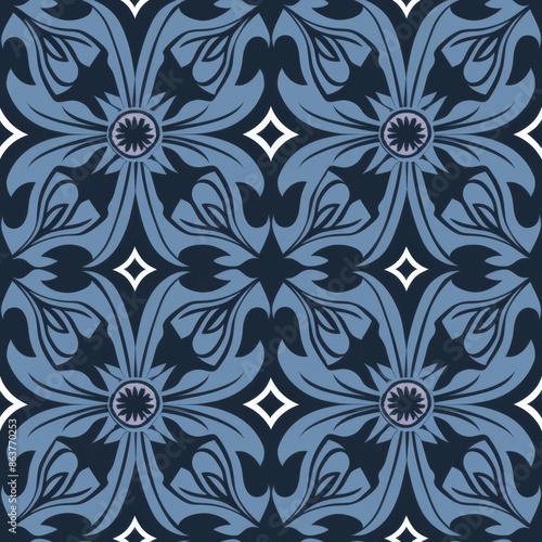 © Witch, Fototapeta premium Seamless blue floral damask pattern. Elegant vintage floral background, wallpaper, textile, wrapping paper design. Victorian floral repeat pattern.