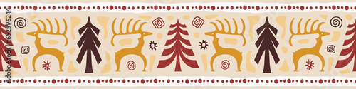 Obraz premium Seamless border, deer and spruce, Christmas pattern, ethnic background, vector banner