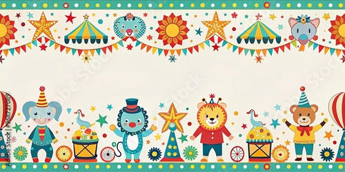 Fototapeta premium Seamless border design with circus animals and holiday elements for a festive celebration