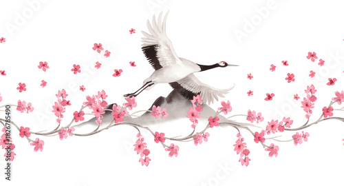 © Nataliia, Fototapeta premium Seamless border of flyind japanese crane with the mountains and sakura on background. Watercolor handmade illustration. For fabric, wallpaper, greeting cards, design, decoration and illustration.