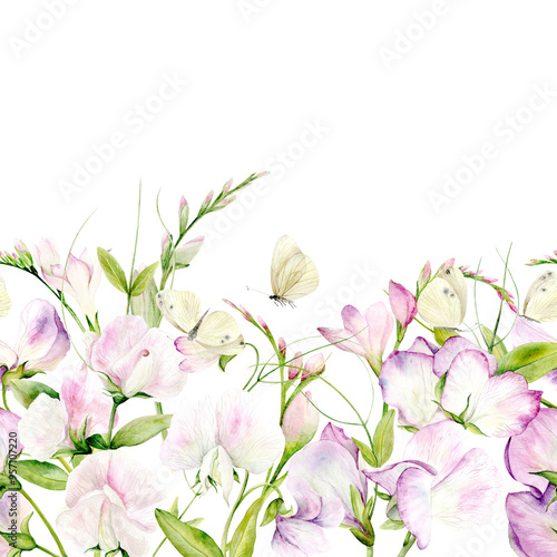 Fototapeta premium Seamless border of watercolor flowers of fragrant peas and butterflies. The illustration is hand drawn in pastel colors. Suitable for card designs, textiles and scrapbooking.