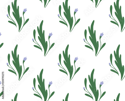 © roze ultra, Naklejka premium Seamless botanical pattern with tiny Blue Flowers and soft Green Leaves. Hand-drawn floral ornament for fabric, wallpaper, wrapping. Flat elegant vector illustration.