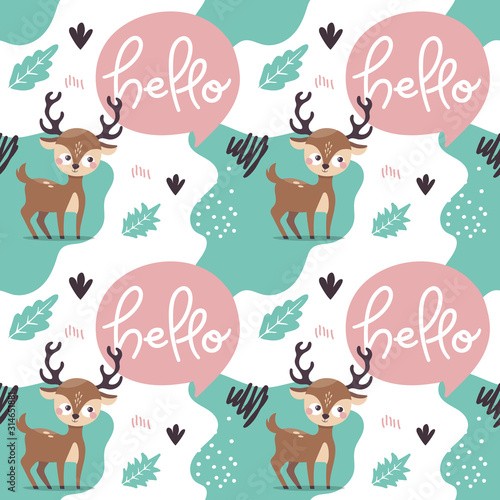 Obraz premium Seamless bright colorful cute pattern with deer, friends, Valentines Day, plant, leaf
