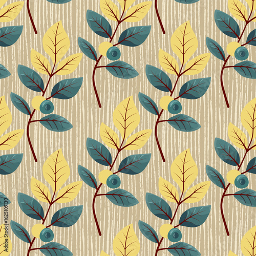 © Victoriya, Obraz premium Seamless burlap texture pattern with leaves and berries. Natural jute sackcloth background with hand-drawn botanical elements. Rustic, eco-style textile design, ideal for organic packaging, home decor