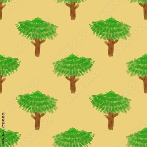 © Pensri, Fototapeta premium Seamless canopy tree pattern – hand-drawn wide leafy trees on beige background