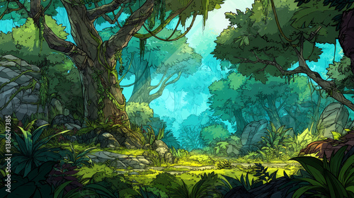© Nari, Fototapeta premium Seamless cartoon jungle landscape, vector unending background with separated layers for game.