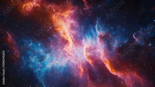 © Володимир Кучмійов, Naklejka premium Seamless Celestial Nebula Pattern Background Featuring Deep Space Vibrant Colors of Red, Blue, and Purple