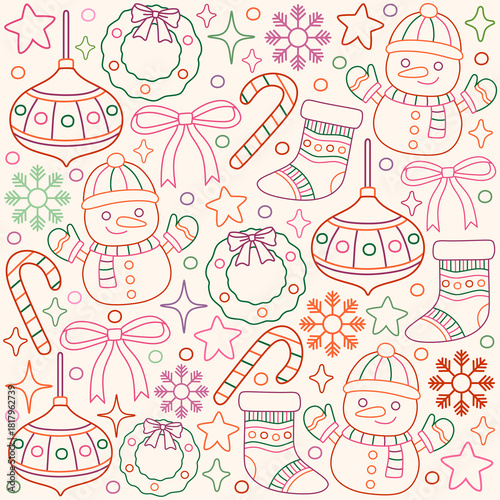 © Mahalili, Fototapeta premium Seamless Christmas Outline Pattern. Winter Holiday Doodle Background with Snowman, Ornament, and Stocking.