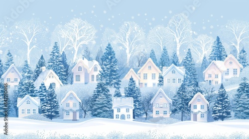© suyu, Naklejka premium Seamless Christmas Village Border with White Houses and Fir Trees on Light Blue Winter Background, Illustrating a Fairy Tale Winter Landscape
