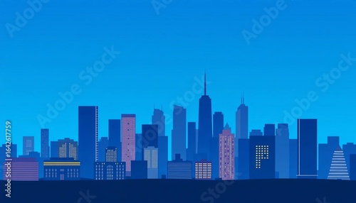 © Boonyapawn, Obraz premium Seamless city skyline silhouette, modern flat design, layered buildings, simple blue background, design, backdrop