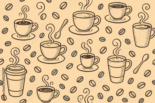 Obraz premium Seamless coffee pattern with hand-drawn cups, mugs, steam, spoons, and coffee beans on beige background
