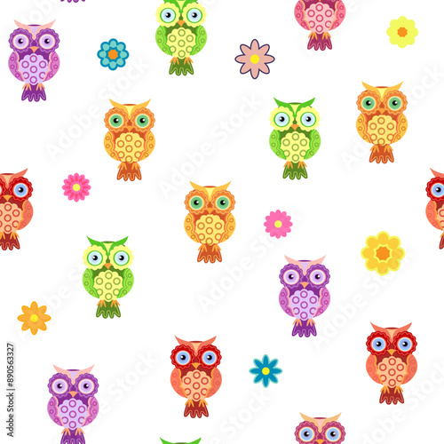 Obraz premium Seamless colorful owl pattern for children with flowers, clouds, branches