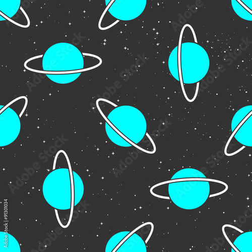 © acidmagenta, Fototapeta premium Seamless cosmic pattern with cute blue planets on a black starry sky background in pop-art style