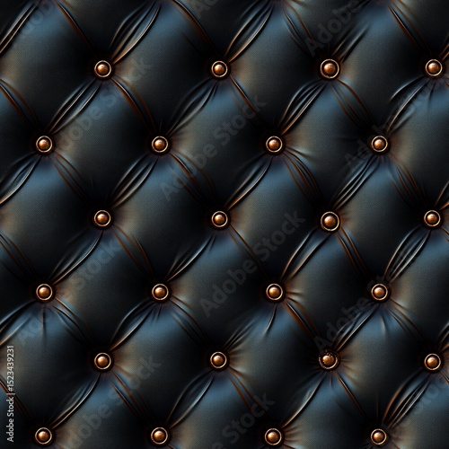 © Sergey, Fototapeta premium Seamless, dark black leather capitone upholstery with subtle button tufting and metallic bronze highlights, creating a classic and sophisticated texture ideal for elegant backgrounds and designs.