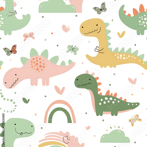 © alexandre, Fototapeta premium Seamless design cute dinosaurs pattern pastel kid wallpaper. generative ai