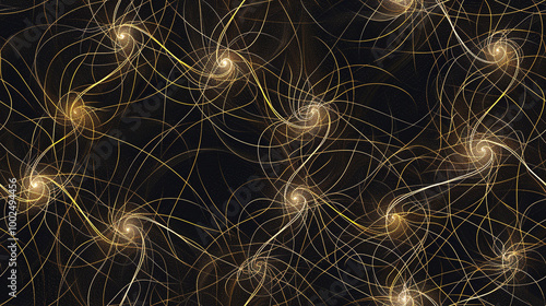 Obraz premium Seamless design of thin gold lines forming a complex spiral pattern with glowing lights inside, set against a dark background
