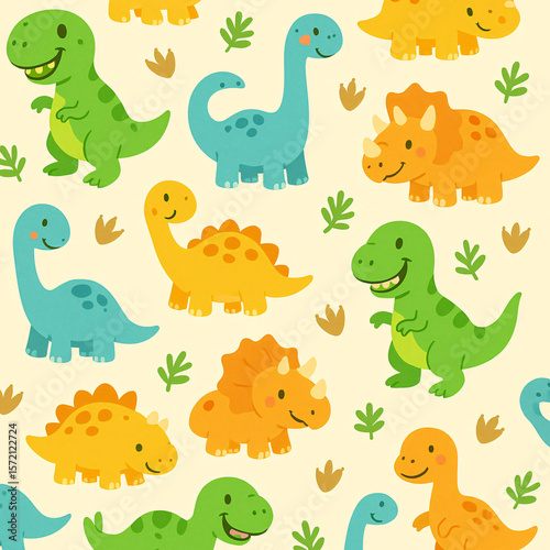 © MIQ, Naklejka premium Seamless Dinosaur Pattern with Cute Cartoon T-Rex, Triceratops, and Sauropods