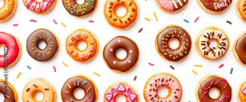 Fototapeta premium Seamless donut pattern, various toppings, white background, pastel, delicious