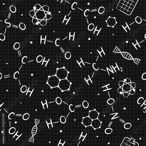 © JuliPaper, Fototapeta premium Seamless doodle pattern with chemistry elements on blackboard. Vector background. School pattern on page from a notebook in a cage.