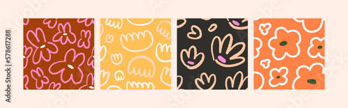 Obraz premium Seamless doodle patterns with flowers, abstract shapes set. Repeating prints, endless backgrounds. Naive floral textures designs for textile, fabric. Printable trendy flat vector illustrations