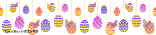 Fototapeta premium Seamless Easter egg pattern is hanging from white bows on transparent layer with butterflies