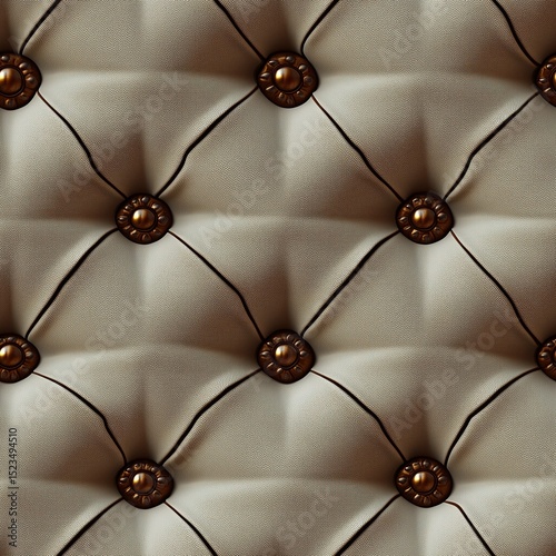Fototapeta premium Seamless, elegant beige fabric capitone upholstery with intricate button tufting and metallic bronze accents, creating a refined texture ideal for classic backgrounds and interior designs.