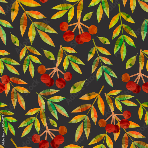 Obraz premium Seamless fall pattern with leaves and red rowan berries on a dark background. Painted with watercolor in collage technique.