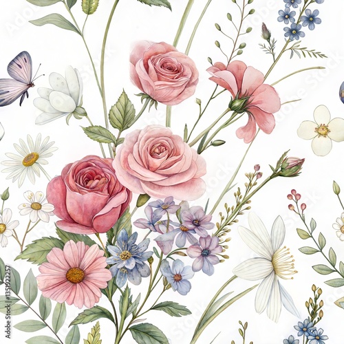 Fototapeta premium Seamless floral pattern featuring a variety of flowers, designed in a watercolor style. (Flower)