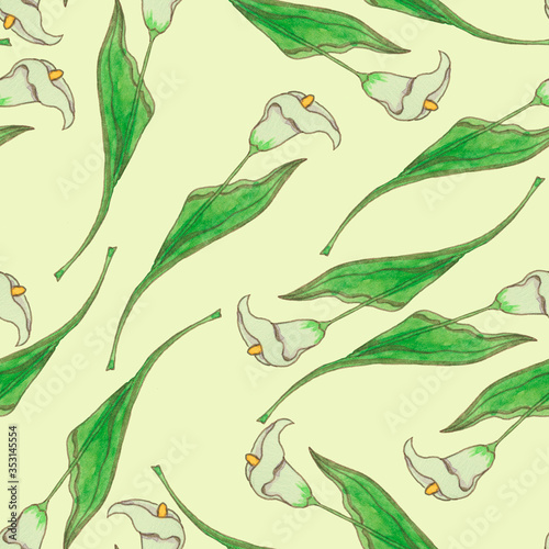 Fototapeta premium Seamless floral pattern. Hand drawn. Cute calla lilies on yellow background...