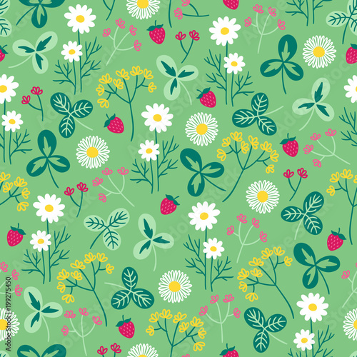 Obraz premium Seamless floral pattern with chamomile, clover and wild strawberry