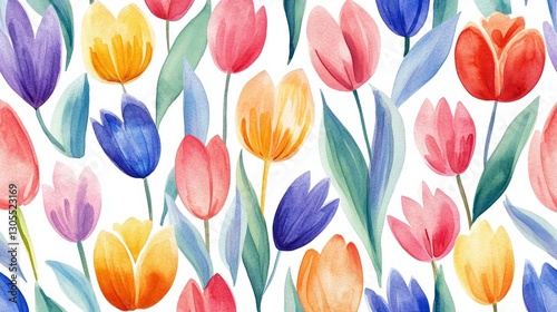 © Sunny, Fototapeta premium Seamless floral pattern with colorful tulips blooming on white background creates a vibrant and captivating design