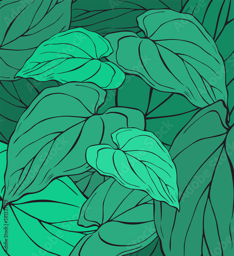 © bigmen, Fototapeta premium Seamless floral pattern with green leaves on green background