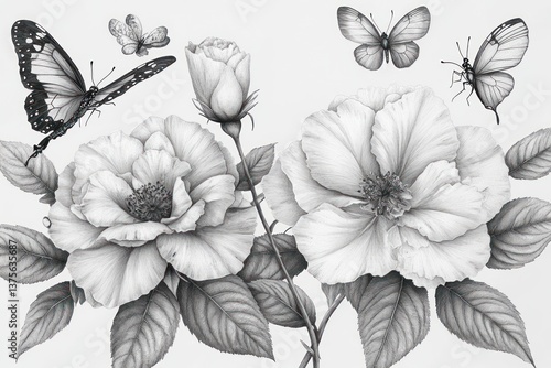 Fototapeta premium Seamless Floral Pattern with Hand-Drawn Roses Peonies Lilies Butterflies and Dragonflies