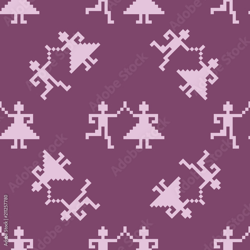 © Perlav, Obraz premium Seamless folklore pixel pattern with dancing people