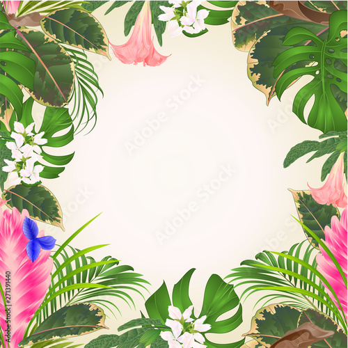 © zdenat5, Naklejka premium Seamless frame Tillandsia cyanea bouquet with tropical flowers palm,philodendron on a white background vintage vector illustration editable hand draw