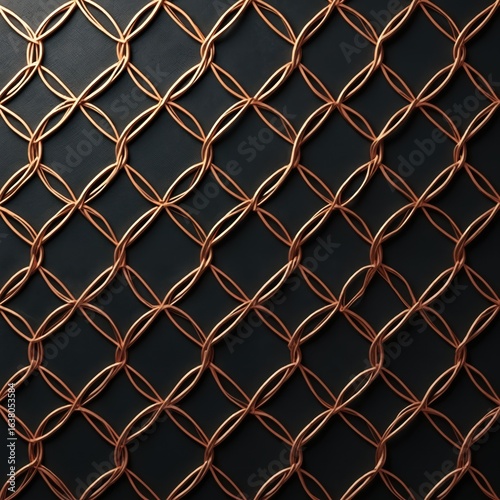 Fototapeta premium Seamless geometric pattern featuring intertwined copper circles on dark background. Elegant, decorative, modern repeating graphic with sophisticated abstract luxury texture. Ideal for fabric,