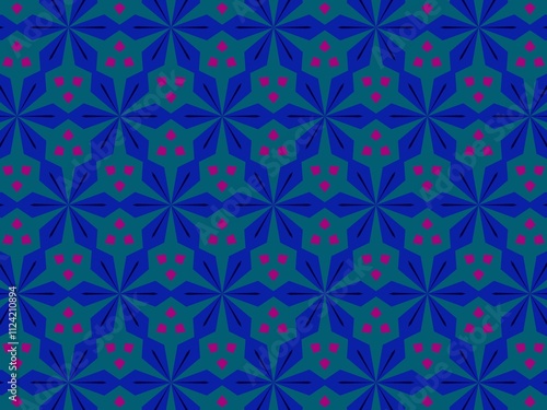 Fototapeta premium Seamless geometric pattern with blue, teal, and pink starburst shapes.
