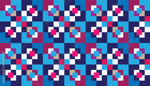 Fototapeta premium Seamless geometric pattern with layered square motifs in blue, purple, pink,...