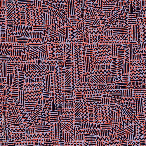 Fototapeta premium Seamless geometric vector pattern in rythmic ethnic Memphis style, linear...