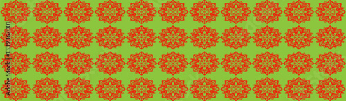 © Samroni Arrosid, Fototapeta premium Seamless green background with intricate red mandala patterns arranged in a symmetrical grid. Ideal for wallpapers, textiles, invitations, and decor