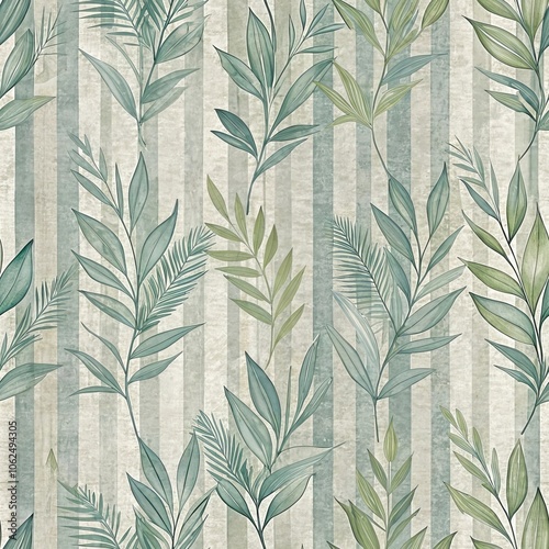 Fototapeta premium Seamless green foliage pattern with striped background for elegant interior...