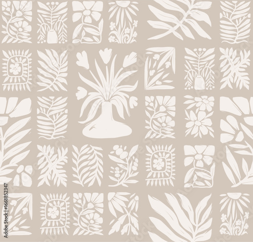 © Yumeee, Obraz premium Seamless groovy linocut vector floral pattern with decorative botanical frames