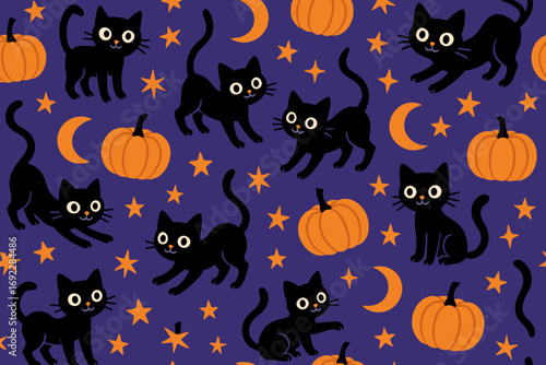 Fototapeta premium Seamless Halloween pattern with cute black cats, pumpkins, stars, and...