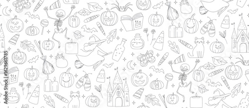 Fototapeta premium Seamless Halloween Pattern with Witches, Pumpkins, Cats and Castle Cute Doodle Vector