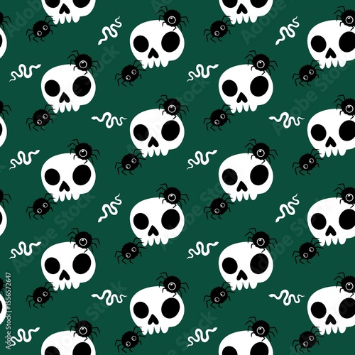 © Tetiana, Naklejka premium Seamless Halloween skulls and spider pattern for wallpaper and fabrics and textiles and packaging and linens