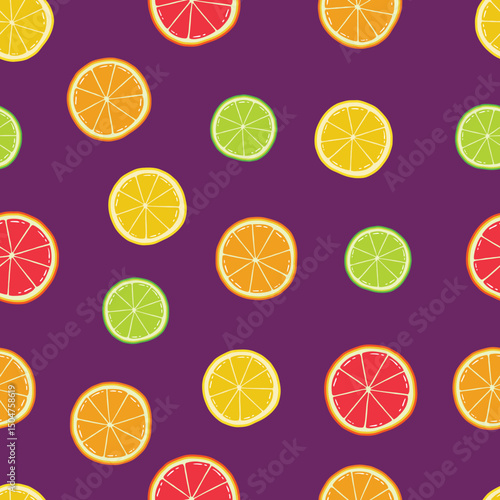 © Super-Si-Ayan, Obraz premium Seamless Hand Drawn Sliced Grapefruit Orange Lemon and Lime Pattern Design Purple Background