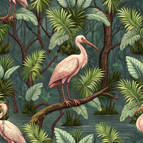 © Thanawin, Fototapeta premium Seamless heron perched on a branch surrounded by nature. It has white-pink feathers and a long beak. in tropical jungle environments for attaching wallpaper, fabric or decorative textiles to cards