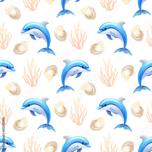 © Anastasiia, Naklejka premium Seamless marine-themed pattern with blue dolphins, coral branches, and seashells on white background